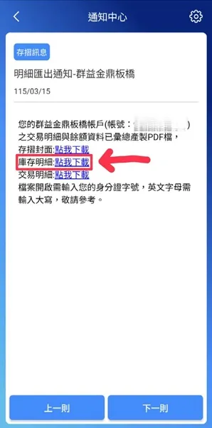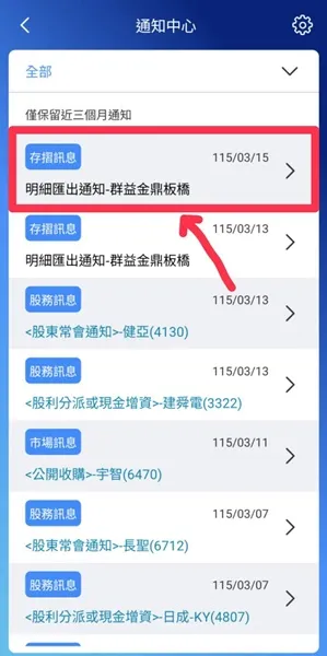 步驟3:5分鐘後進入「通知中心」點選存摺訊息