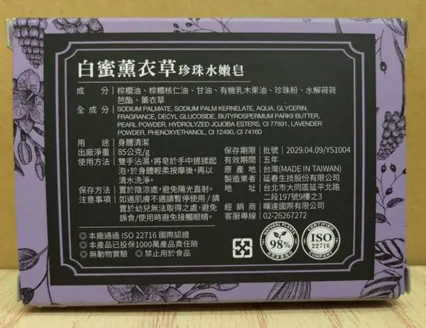 紀念品名稱:白蜜薰衣草珍珠水嫩皂(1入)